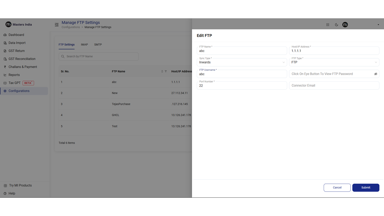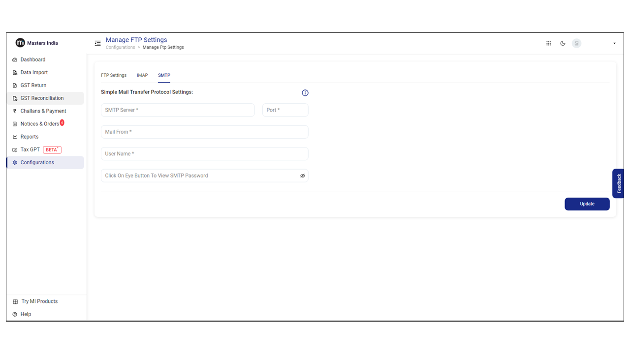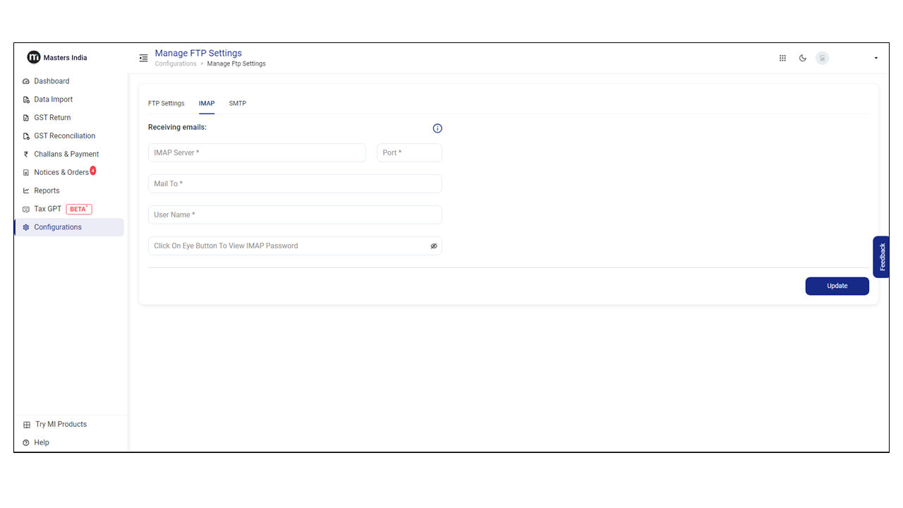 IMAP (Internet Message Access Protocol) allows users to receive their vendor email on Masters India GST Software whereas SMTP (Simple Mail Transfer Protocol) is employed for sending emails to them.&#x20;