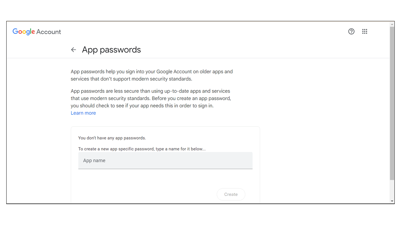 2. Go ahead and create a new App Password in your email account. Login to your mail ID, go to account settings and search for "App Password". Create a new App and create an App password for the same.