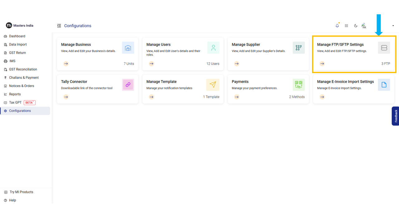 In the configuration module, click on "Manage FTP/SFTP Settings." The screen will navigate to the Manage FTP/SFTP tab.