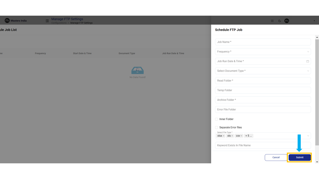 To schedule a new FTP job, click the "Add" button and fill in all the required fields. Once completed, click the "Submit" button to