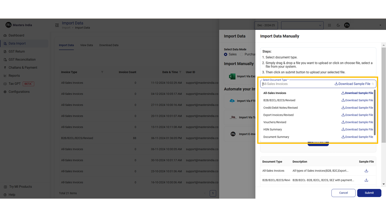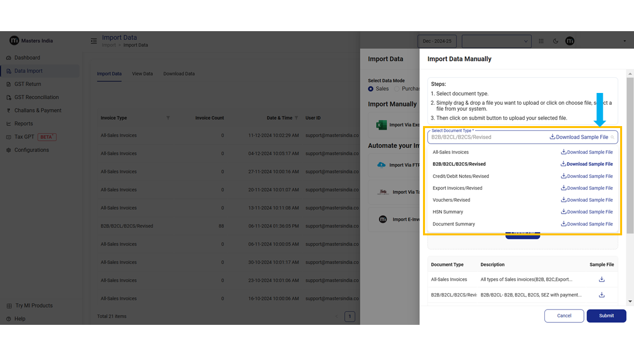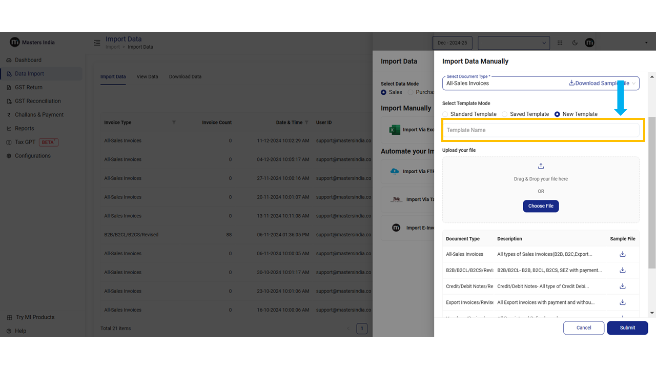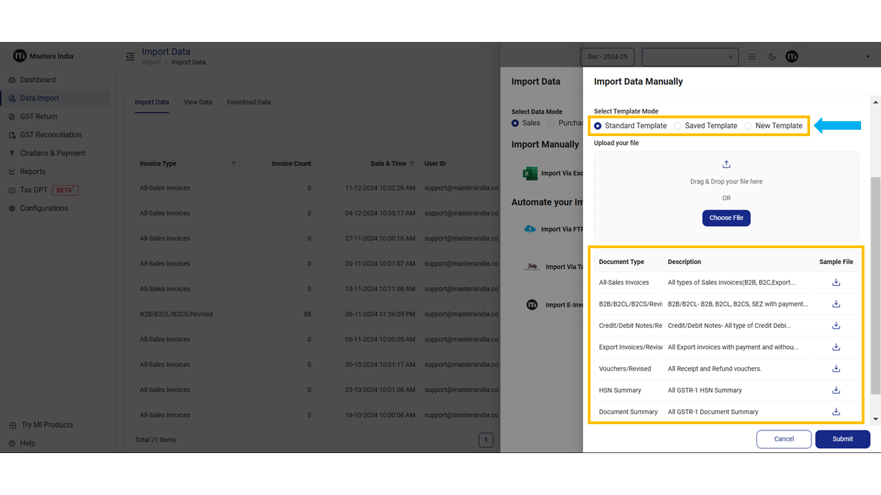 A. **Standard Template**: When a user prepares data using the templates provided by Masters India, this method saves time. Users can download the sample files from the table given at the bottom.