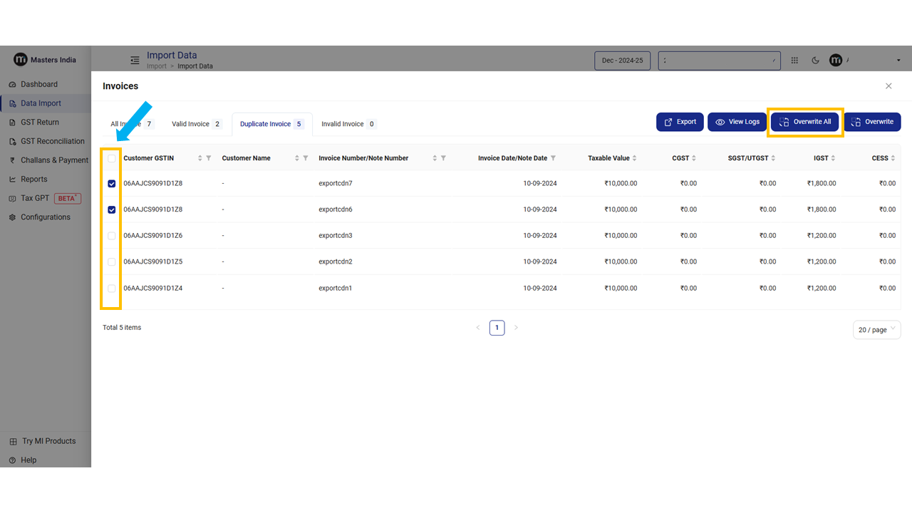 If the data is a duplicate, the user has two options: they can either ignore the invoices since they already exist in the system or if they have made changes to an invoice that has the same invoice or note number, they can choose to update those changes. To do this, click on “Overwrite” (for selected invoices) or “Overwrite All” (if you want to overwrite all duplicate invoices). The invoices will then be transferred to the valid bucket, and the new data will be saved.