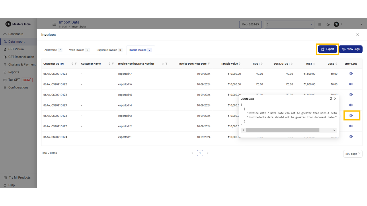 If the imported data is invalid, the user must re-import it. To identify the errors in the imported data, the user should check the Invalid bucket. This bucket contains all the invalid invoices, each accompanied by an error message formatted in JSON, which details the specific error for each invoice.