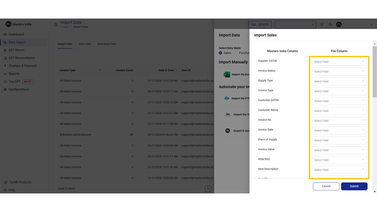 The column headers from the uploaded file will be fetched and provided for mapping with the Masters India columns. All mandatory columns must be mapped before proceeding with the import.