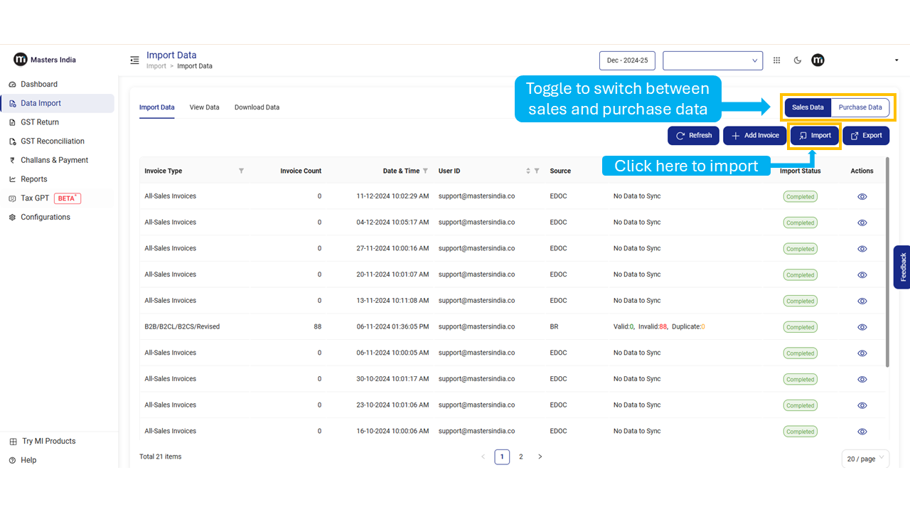 To view Sales data make sure the toggle is set to “Sales Data”. Similarly, for Purchase click the toggle to shift to “Purchase Data”.