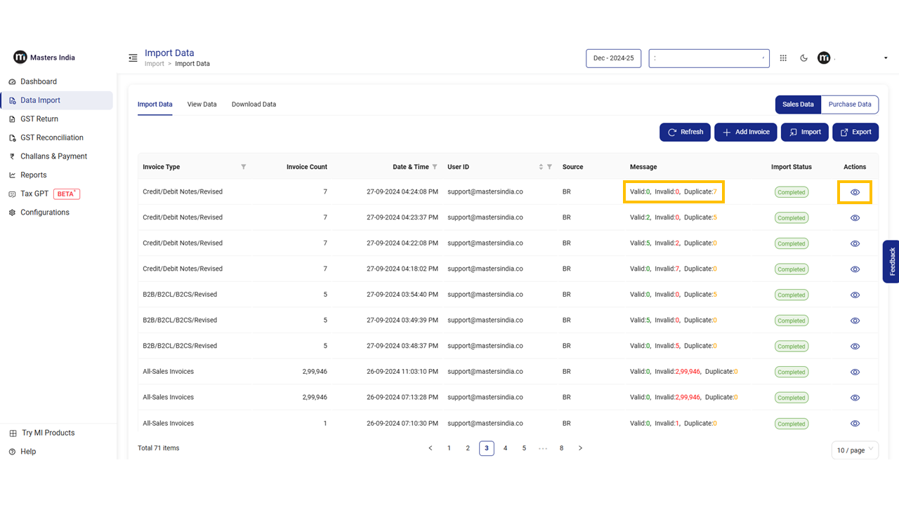 The status of the invoice will be displayed in the "Message" column. Here, you will find the counts of "Valid," "Invalid," and "Duplicates." Users can also click the eye icon in the "Action" column to view the invoice listings in each category.