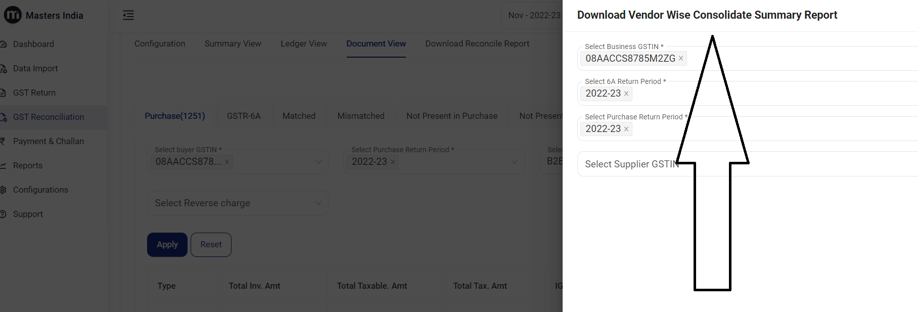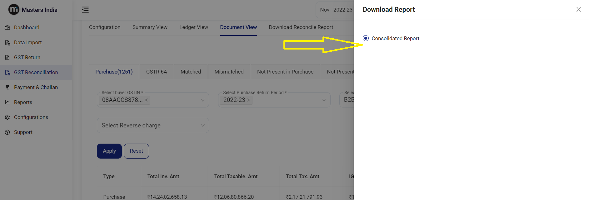'Download' Button: The user can click the 'Global 'Download' button on the top right corner to get Reconciliation Reports 'Consolidated Reports' or 'Vendor Wise Summary Report'.