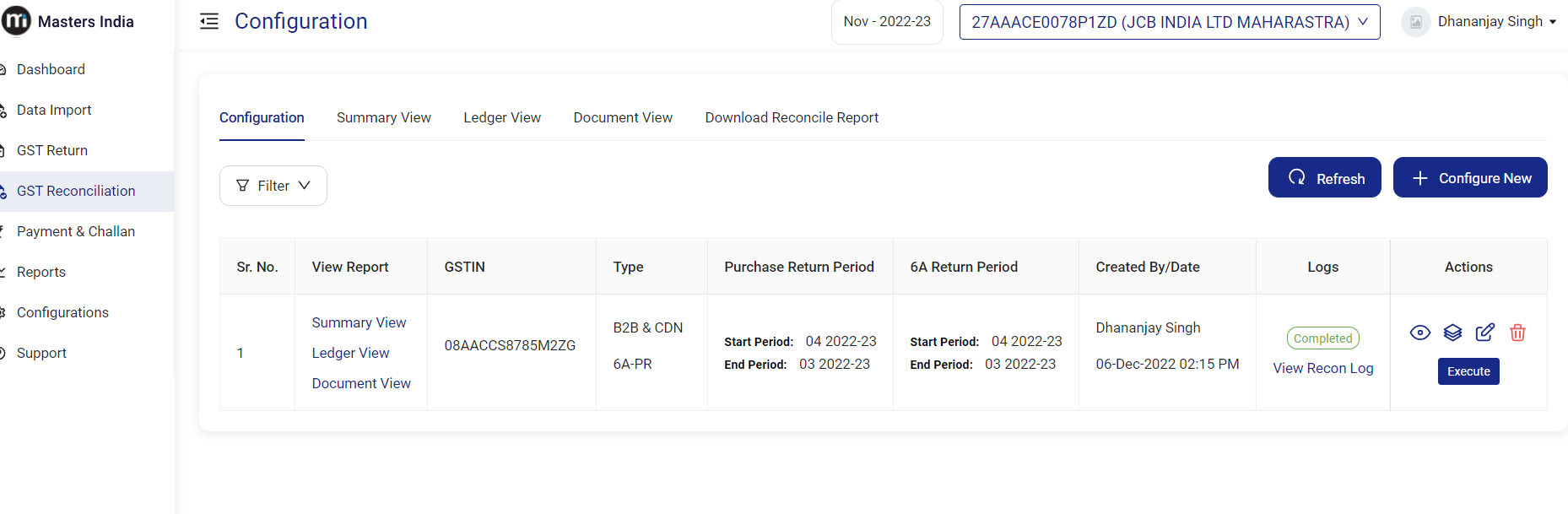 **Step 2**: After Signing in the 'Dashboard' module will appear. Click on the 'GST Reconciliation' module on the Navigational bar on the left.&#x20;