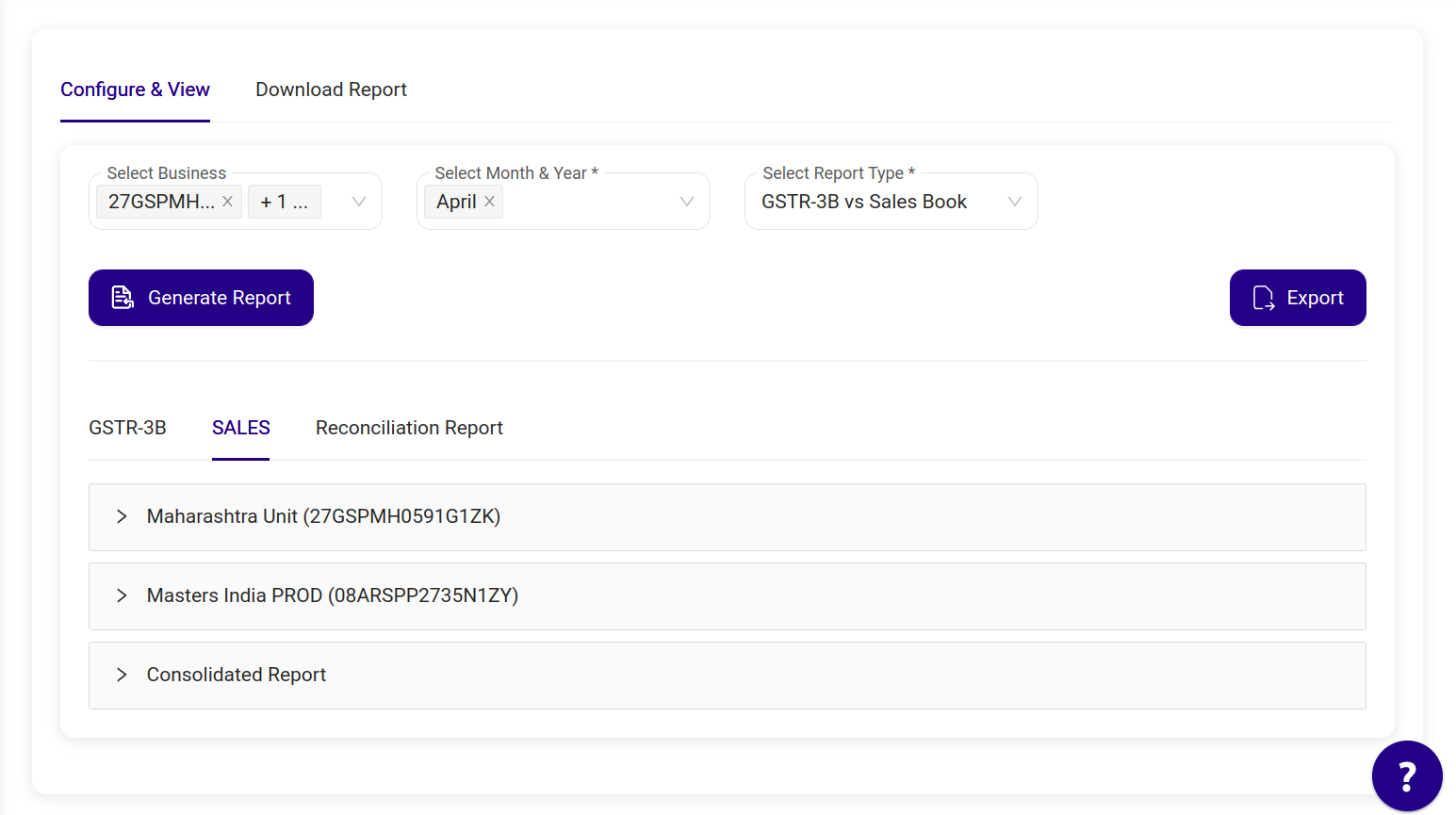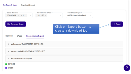 After clicking on the Generate Report button the reports will be generated and the user can view the individual report as well as the Reconciliation Report.