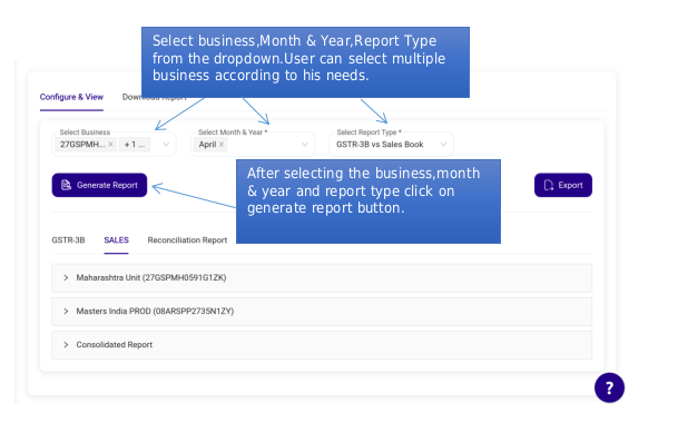 To View the report user first have to select the business,Month & year and Report type and then click on Generate Report button.